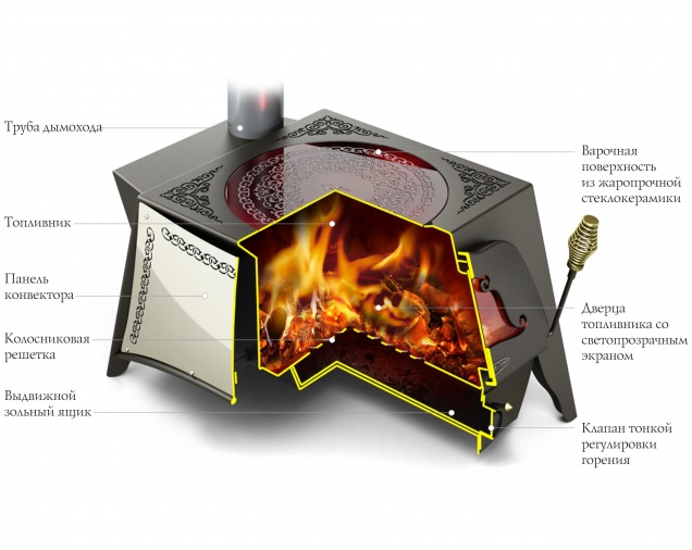 Корпус печи изготовлен из высоколегированной жаростойкой стали с содержанием хрома до 13%. Печь имеет возможность тонкой настройки интенсивности горения и поддерживает режим длительного горения. Чугунная дверца печи оснащена светопрозрачным экраном и самоохлаждающейся ручкой для удобного управления процессом горения. Съемная стеклокерамическая или чугунная варочная поверхность позволяет готовить пищу на открытом огне, в том числе и в казане.
