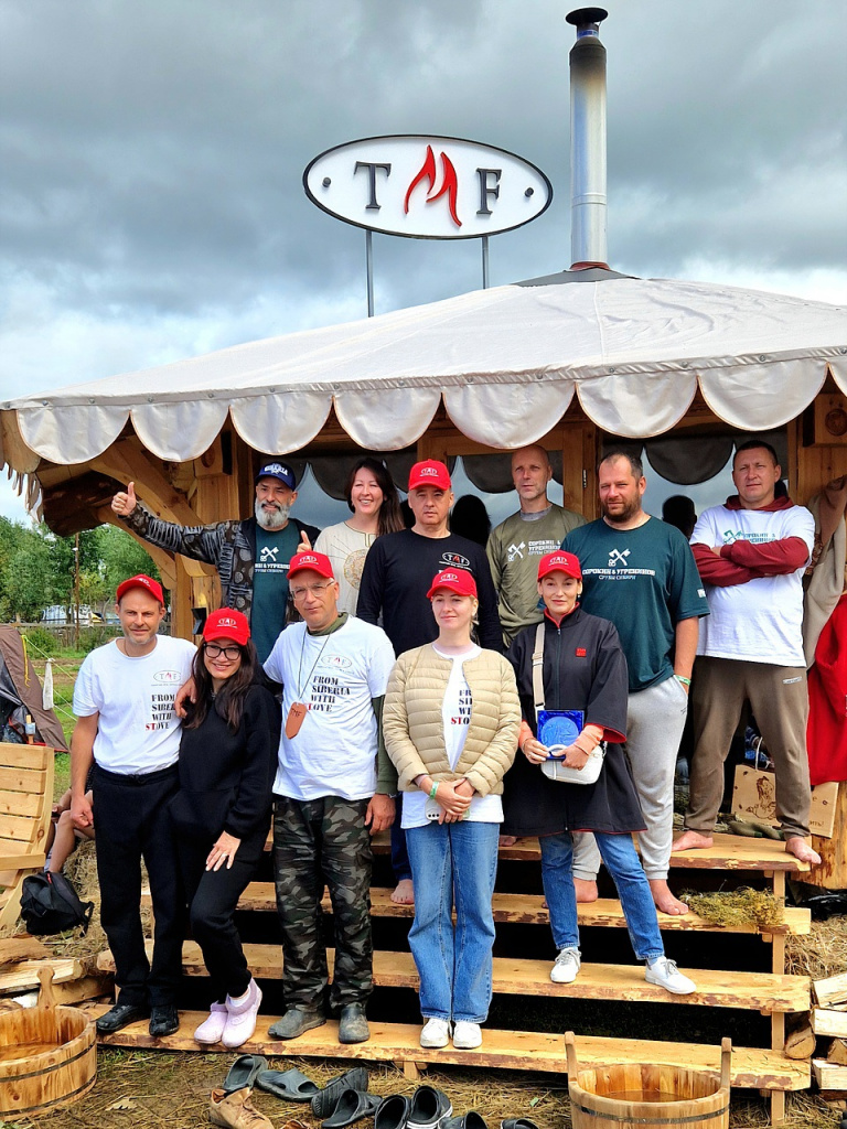 Наша баня стала настоящим центром притяжения: аромат кедрового сруба от наших партнеров Сорокин & Угренинов  привлекал любителей попариться несмотря на дождь и холод. Особое внимание привлекла особенная банная печь TMF Джоконда, которая была представлена впервые.